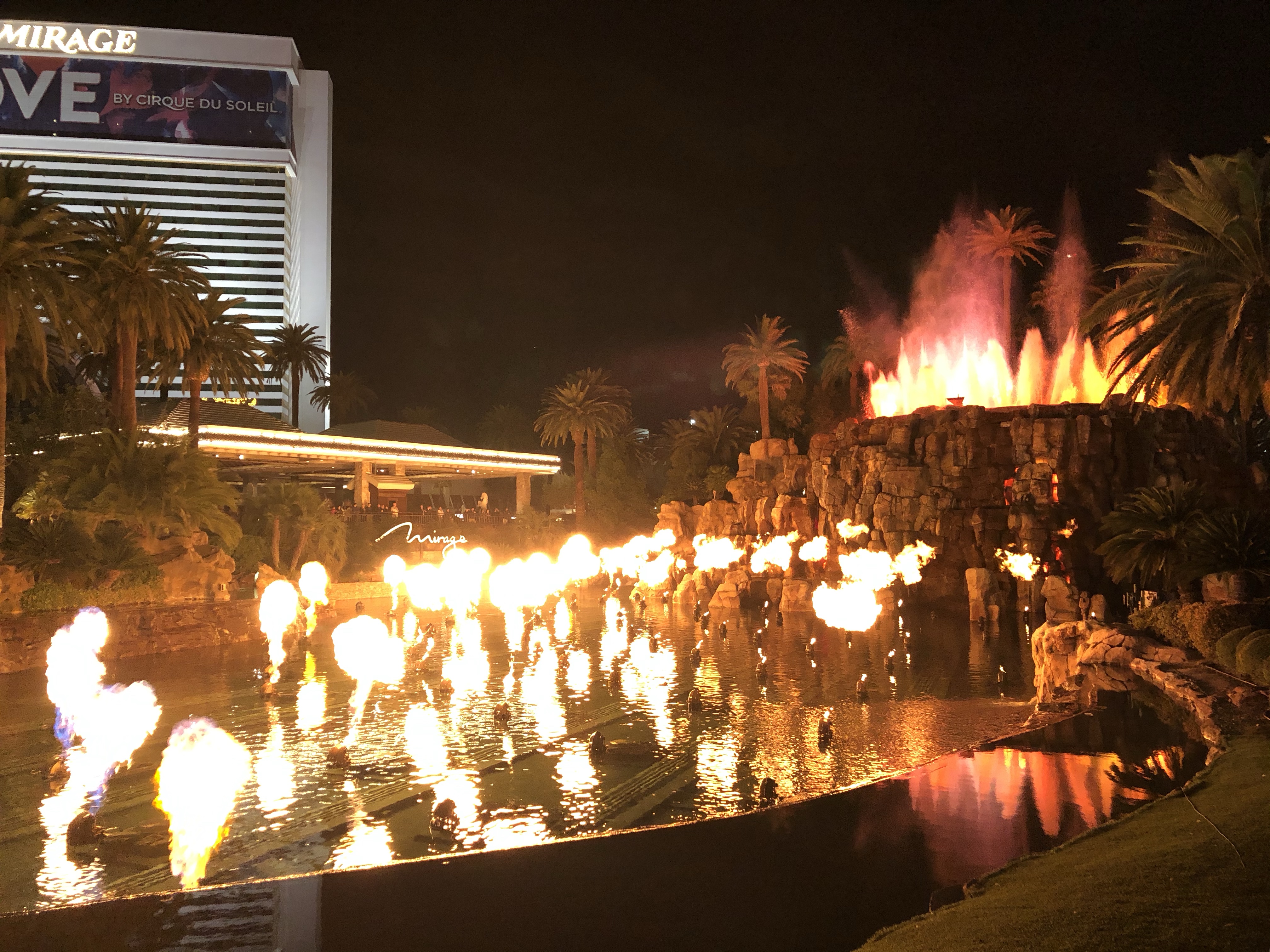 This time we were in luck and we actually got hold of our post. We then decided we would like to see the volcano at The Mirage and The Bellagio fountains at night, which we didn’t get to see last time. There is a place at the beginning of the strip where you can park and camp for free, but it’s completely the opposite end to the two hotels. Not fancying nearly an hours walk in either direction, we drove around to try and find parking closer. There is an abundance of parking on the strip, and a lot of it is even free, but the problem is that it is nearly all in a multistory car parks. This means we can’t have it, as even though we are a small van, we’re still taller than a regular car. In the end we managed to find a car park behind The High Roller, the world’s largest Ferris wheel. It was kinda pricey, about $12 for over 4 hours, but we also then realised that a load of RVs were parked up here and that for $15, we could stay the night. For convenience’s sake, we thought this would do, especially as it was only a 5-minute walk to The Mirage. Before we headed, I checked to see if there was any Groupon offers, as I really wanted to go on wheel, but it was pretty expensive. There was a deal, that meant we could go to Madame Tussauds and the wheel, for $69 each, we would also have access to a 30-minute free bar at both. A bit expensive, but every now and again you have to treat yourselves and spend a bit of money, it was also cheaper than if we had gone and just bought tickets. We decided to head over to Madame Tussauds, and check that we could us the voucher that night, as I’ve made too many groupon mistakes already! As we got to the strip, I noticed the audience gathered at The Mirage, and it turned out we had timed it perfectly to watch the volcano erupting.