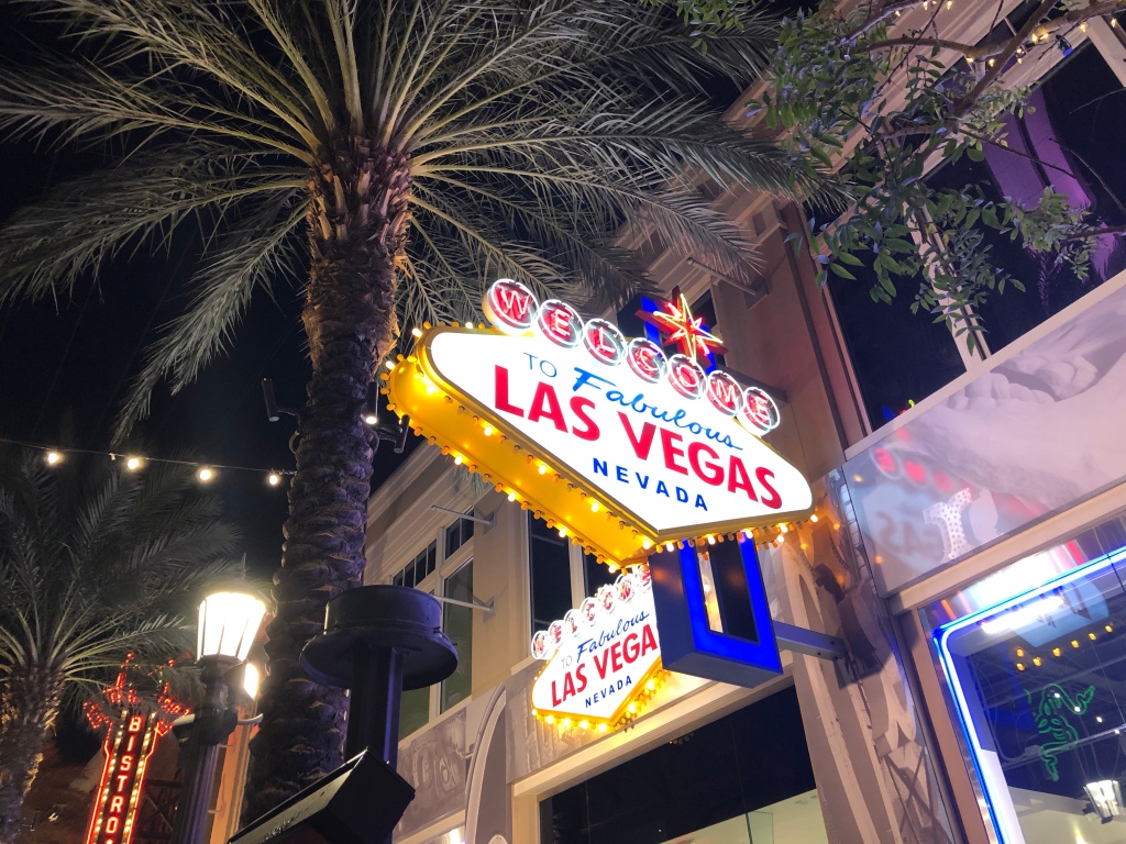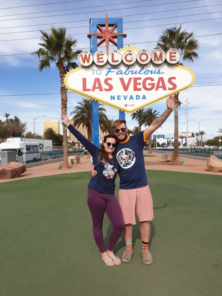 Feeling a little worse for wear in the morning it was time to make a decision about whether we were going north or south. First though I required a stodgy breakfast, and we headed off to a Dunkin’ drive thru. The one thing left on the list was to see the Vegas sign, so it was here that we parked up and ate our breakfast. We then had to queue up to get a picture at the sign, but here we are and we’re headed wearing our newly designed tops!