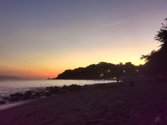 And then we emerge onto a bright sandy beach. There’s not many people, but a few surfers in the water. The waves look pretty good, calm and regular, not too big. Maybe we will carry our boards here after all. Now is a bit late though, and we don’t know where to stop so we decided to head back and find somewhere for the night.
