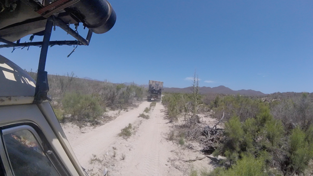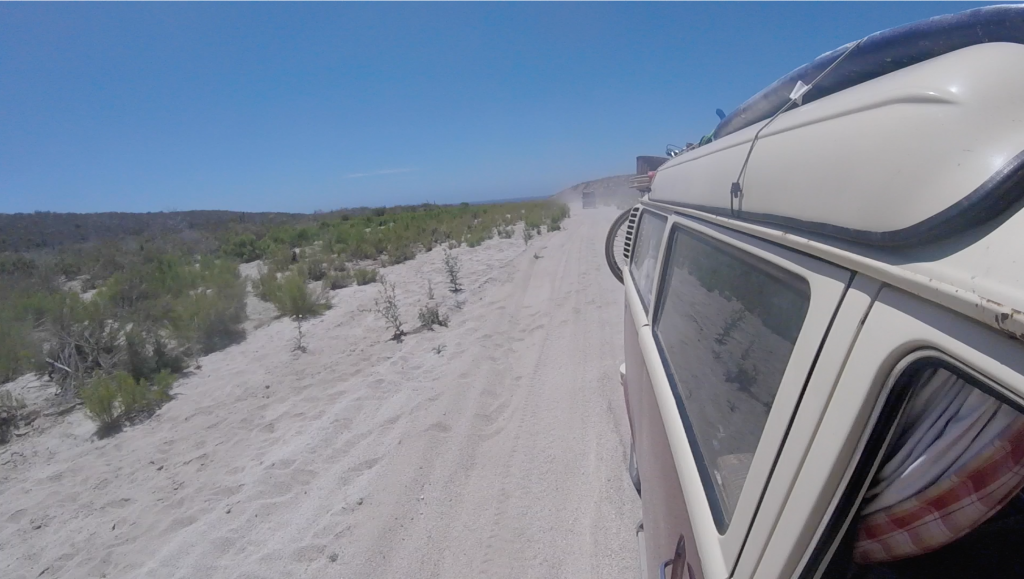 The key for us to drive successfully in soft sand is constant speed. As soon as you stop, you get stuck. So Lee proceeded to attack the track at speed, in second gear. It’s only a two mile straight to make to the end, and we hurtled along, occasionally losing the back end on a particularly loose path of sand. On several occasions I felt the van slow as the wheels struggled for traction and slipped, but always at the last section Lee managed to get us back onto more solid ground and against all the odds we kept going, Bruno following along behind.
