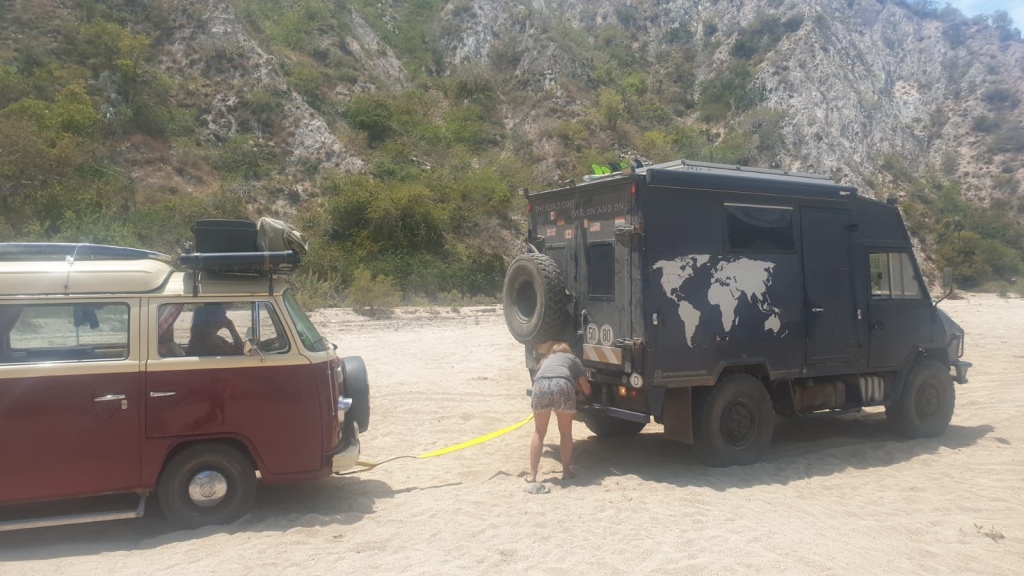We proceeded to air down our tyres, and then everyone got ready to push. I’m generally the designated driver in these instances, as Lee is not only a stronger pusher, but also a heavier weight to sit in the van. The whole area was very soft and deep sand, unsurprisingly for a riverbed. This meant that turning around would have not been an easy thing, leaving me with not much choice but to reverse back out on a narrow and quite bumpy track that we came in on. Sitting in the van awaiting to be pushed, I looked behind and observed the angle we were sitting at, wondering if this would be more of a towing situation. Everyone braced themselves on the front of Ruby, and I got balanced the clutch. The back wheels spun for a second, trying to find traction and then engine with help from 5 other people tried to push us back. We nearly had it, when it stalled. The clutch in the van is just not strong enough for these situations, and while the wheels don’t spin, there is just not enough torque to pull us out. Take two was more successful, and suddenly she leapt backwards out of the hole she had dug for herself. Not wanting to stop or go to slowly, I reversed back out down the lumpy track rather quicker than I would have chosen to. Managing not to hit anything, we were back to where we had been half an hour ago. Only managing to have gone a few metres from the road, I wasn’t that optimistic about how far we would actually make it. Still, with the GoPro at the ready, and Dino back out in front, we set off to give it our best shot.