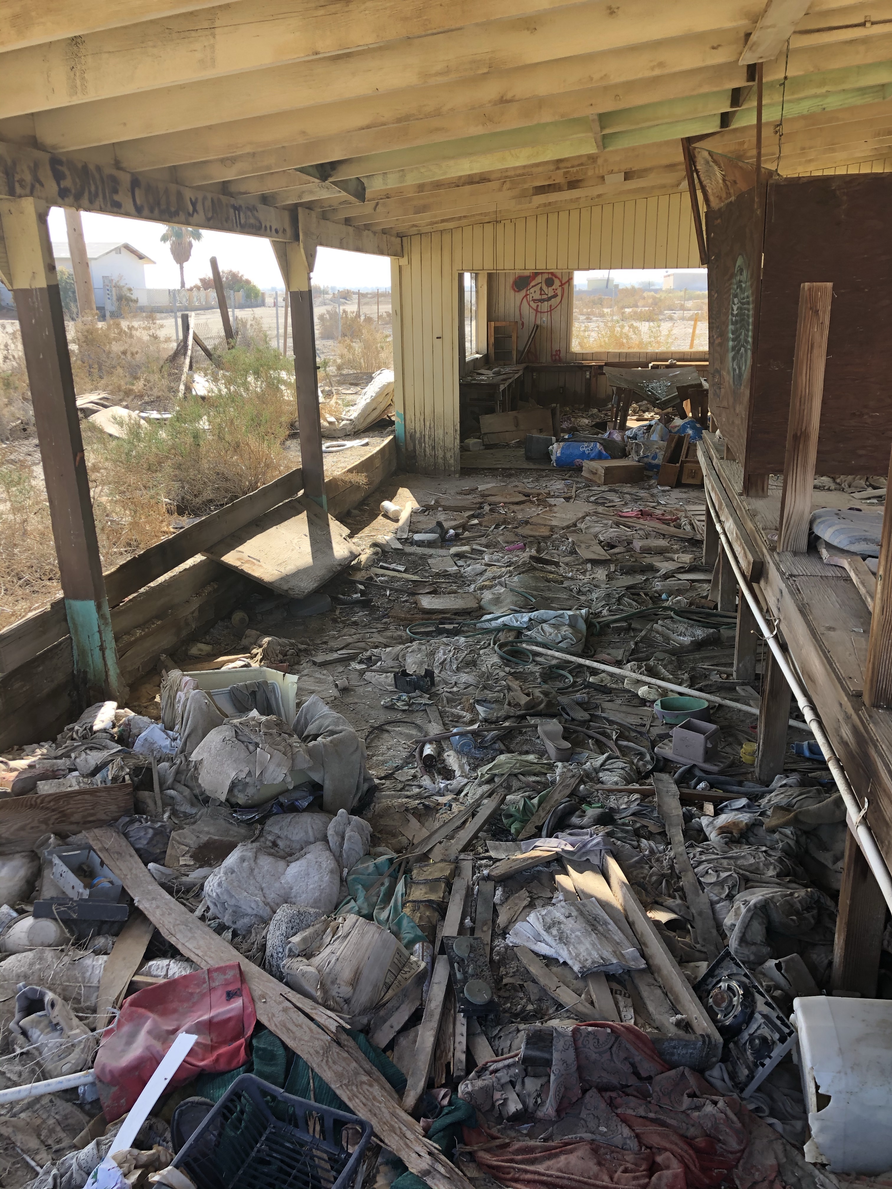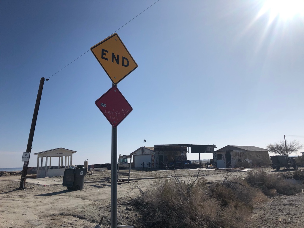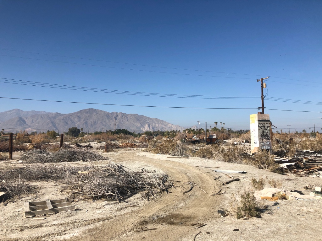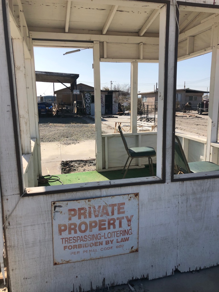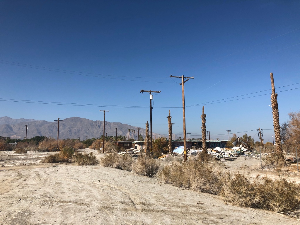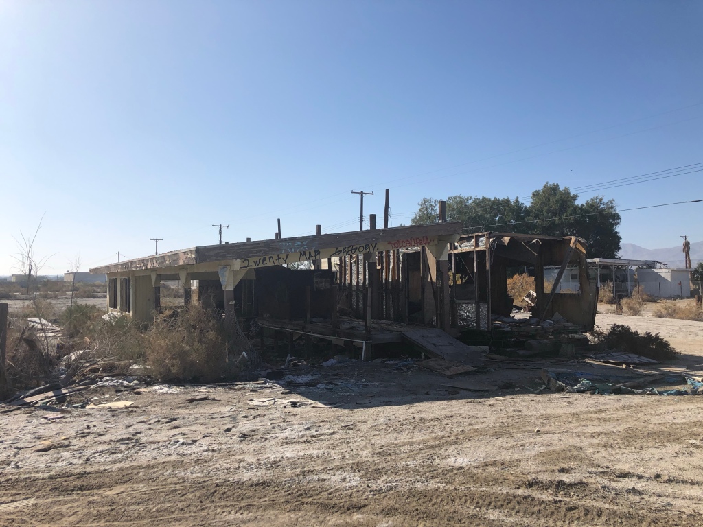 Salton City was indeed a strange place. Apart from a few people living in trailers it is a mixture of abandoned buildings and destroyed buildings alongside a barren wasteland full of dead and dying palm trees.