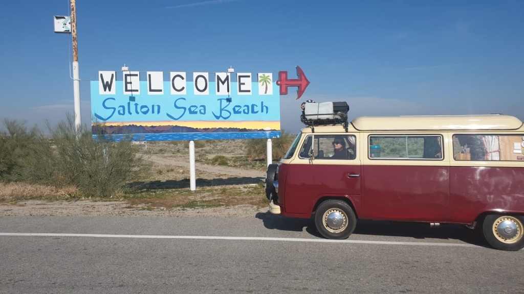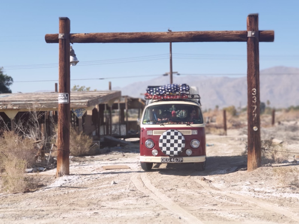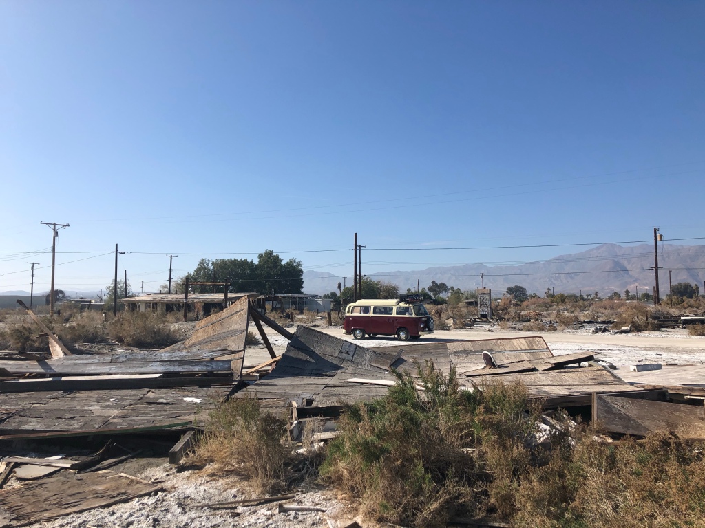 It was a fair drive to Salton Sea, which had been recommended to us by the guys we met at the Drivers Wanted VW Club in LA. It sounded pretty interesting though, a former lakeside resort that had been popular up until the mid 1950’s was now mostly abandoned. However, it all started to go wrong when the salinity in the lake rose to a point where it killed all the fish and by the looks of it most other living things. The resort was abandoned and now is a semi ghost town, with a few houses and people living in trailers and great big gaps in between.