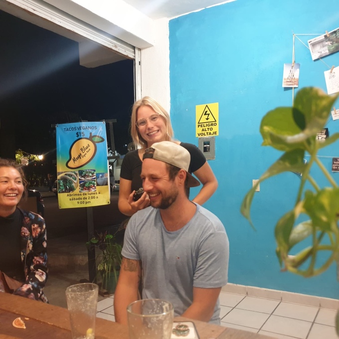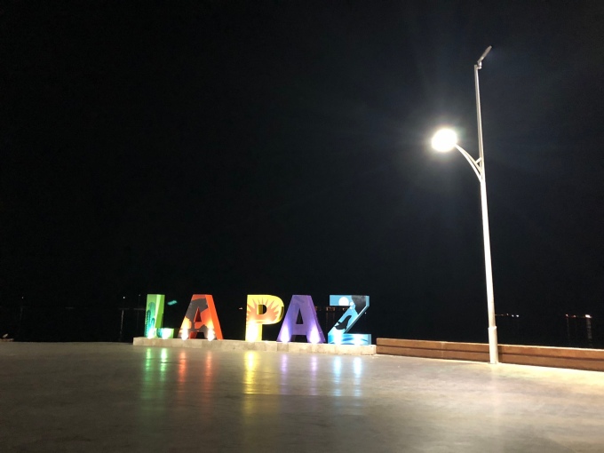 The rest of the day was spent fixing a puncture on Rachel and Ola’s van, before cleaning ourselves up and getting dangerously closed to being dressed up too. We drove to a planned parking spot in the centre of La Paz, the former car park of a now abandoned school. It was full of rubbish, but seemed safe enough and was also close enough to walk to Mango Blues, the vegan restaurant where we were meeting everyone else.