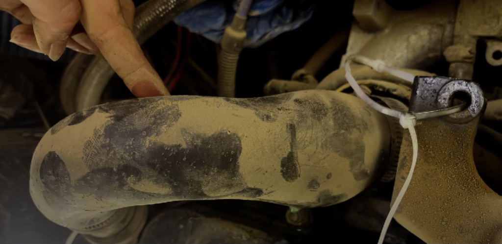 It seemed to have developed a weak point and under the pressure of the operating system, was now twice the size it should be. When I moved it a bit it sprayed a mist of boiling coolant over everything. We were lucky in the fact that there is a little slack in this pipe and we could hopefully cut off the disintegrating end and reattach it again. Now we just had to wait for the engine to cool enough in order to do that, it was a pretty hot day and that was going to take at least half an hour.