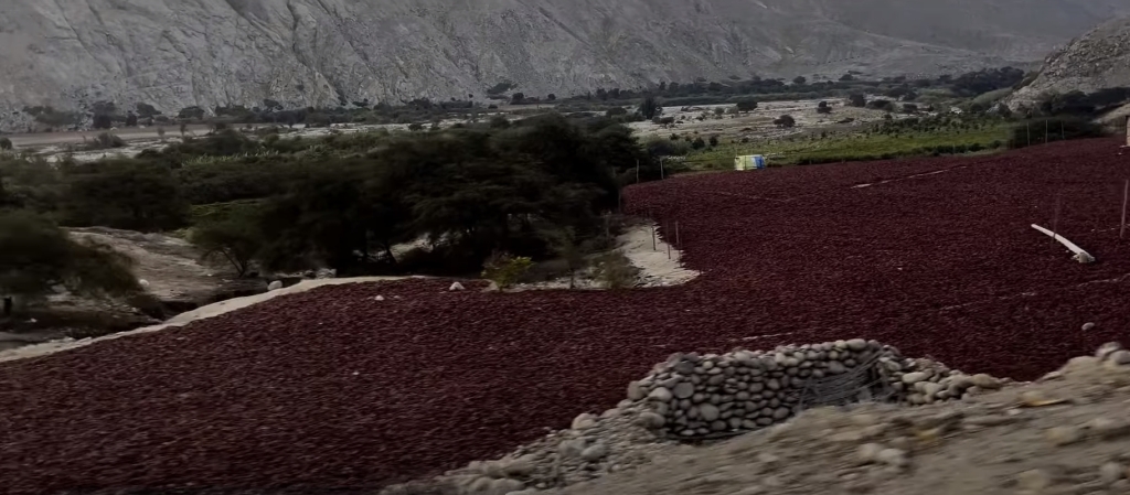 Before too long, we had dropped about 3000m and the road levelled, now running gently downhill in the valley. Again we had an interesting contrast, between the fertile valley and barren mountains that backed it. Down in the valley to the right of the road grew all kinds of different crops, I spotted bananas, papayas and corn to name a few. Up on the left hand side was nothing but sheer rock, dusty and completely barren, where not even grass would grow. It seemed to have its place though. As we drove on we saw fields of red, laid out before us on the gravel to either side. On closer inspection, this was chillies drying in the sun. acres and acres of them, which I assumed had been grown in the valley and brought outside it just a little to make use of the powerful sun.