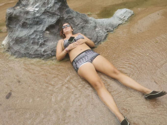 After a long descent which I am sure would be felt in the morning, we arrived in the valley. The shallow river flowed over a sandy river bed, jungle either side. Walking a little way upstream leads to the waterfall, while heading down the river a short way will bring you away from all the people with the place to yourself. We headed downstream for a walk first. Despite the fact that the water looks muddy, it is in fact crystal clear and it's just the colour of the sand.
