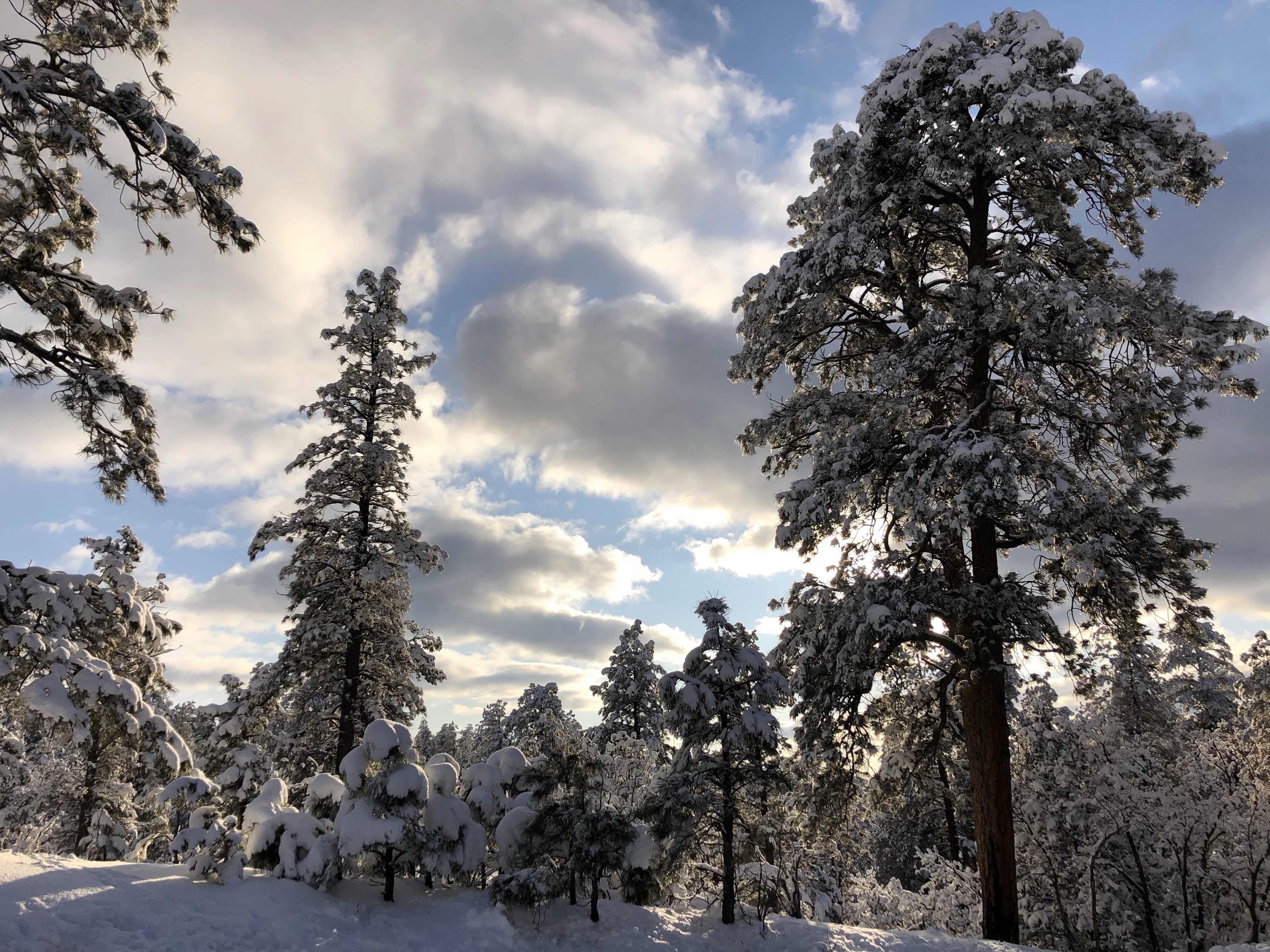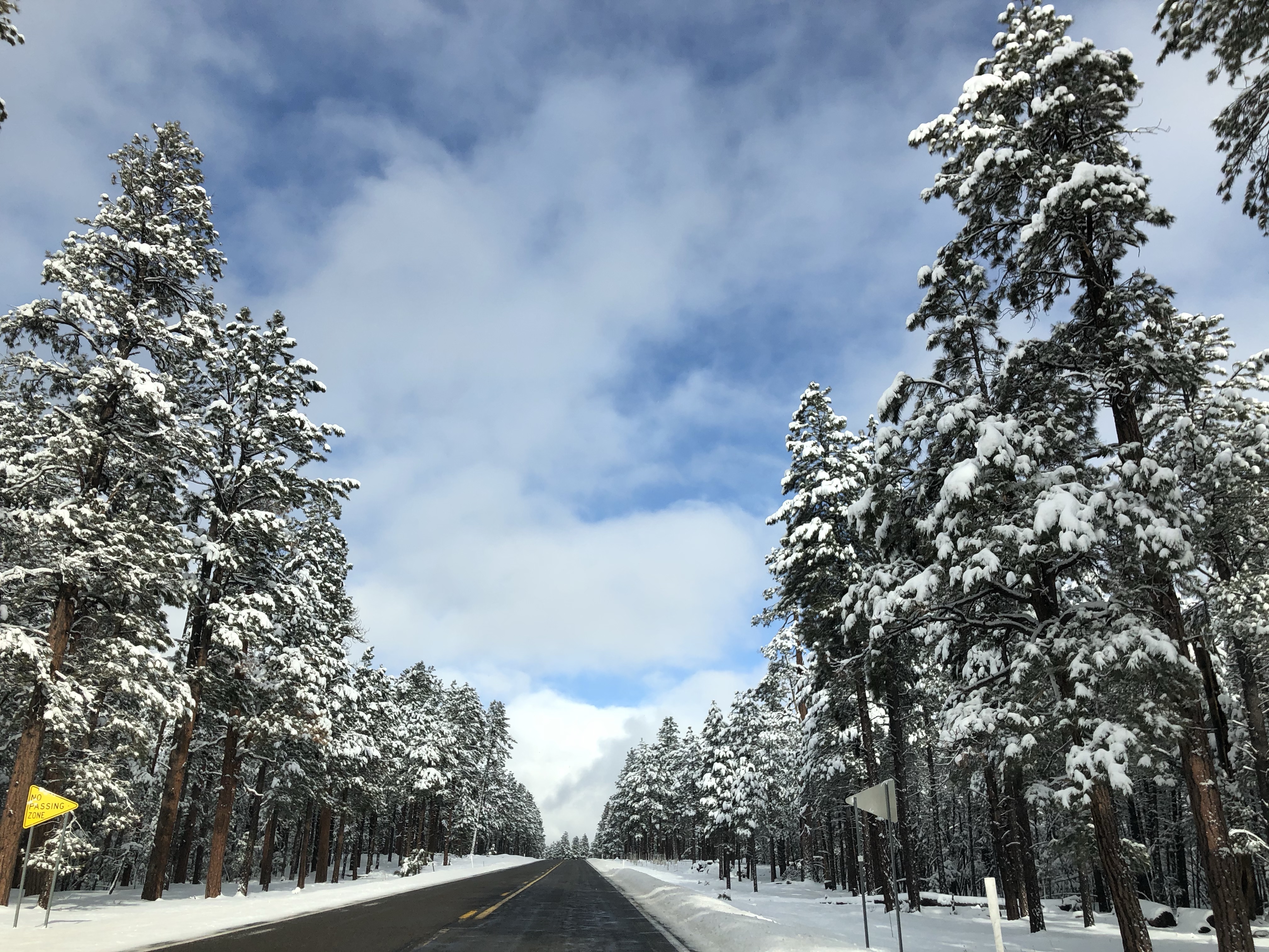 We started to head out on the road towards Page, but after having only gone a short way we hit a stop. There appeared to be a car stuck on the ice on the road ahead with other cars slipping and sliding trying to get it out. We watched 3 people nearly completely lose it on the ice and waited a while before deciding that with still over 50 miles to travel on this road it was probably better to head back to Flagstaff and cut around on the main roads we knew were clear, pretty as it was.