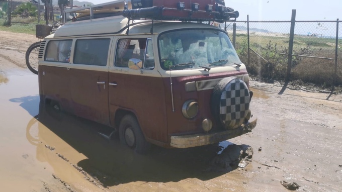 The good thing about Mexico though, is that it’s part of life here. We have pushed many a stuck local out of the sand so maybe we had some good karma. We had barely got out of the cab into the slurry puddle when another Subaru began backing up. Shouting at us to get a tow rope. Another guy was also there offering his car if the other one couldn’t do it. First they tried to pull us out with ratchet straps, but these broke and so we dug out our tow rope. Nothing special, but it had got us out of trouble before, the Subaru slid on the muddy ground until he engaged 4x4 and slowly a dripping and muddy Ruby emerged. He towed us off to the side while another local excitedly filmed the hole thing on his phone while providing a running commentary. Stupid gringos. We thanked them with a couple of beers and set about cleaning the van, we also realised she wouldn’t start.