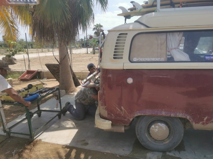 It was when we were in Pemex, the engine sounded horrible. Loud and rattling. I went around to have a look and saw oil pouring out from behind the crank pulley, that was it. We went straight to the nearest garage. The mechanic told us to come back in two hours, so we collected Aimee and went to wait in Baja Beans, hoping that it wasn’t something major.