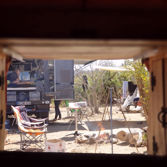They were perfectly friendly, and it made a changed to be welcomed onto a camping spot considering the recent problems we’d been having. Supplying us a with a compost bucket and instructions not to burn the pretty cacti in the campsite, they walked back up the hill to their home and left us to settle in. Our three rigs got ready for a week in the desert.