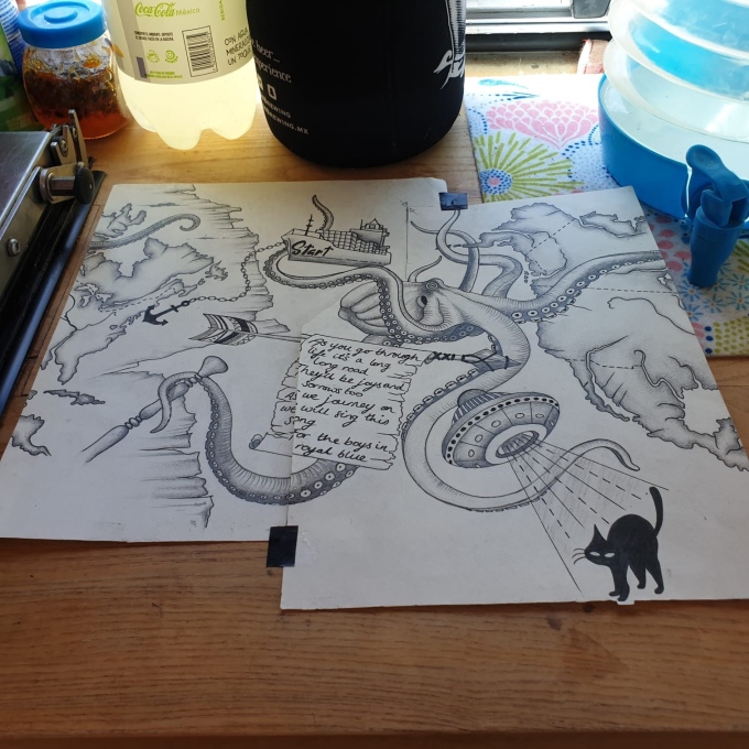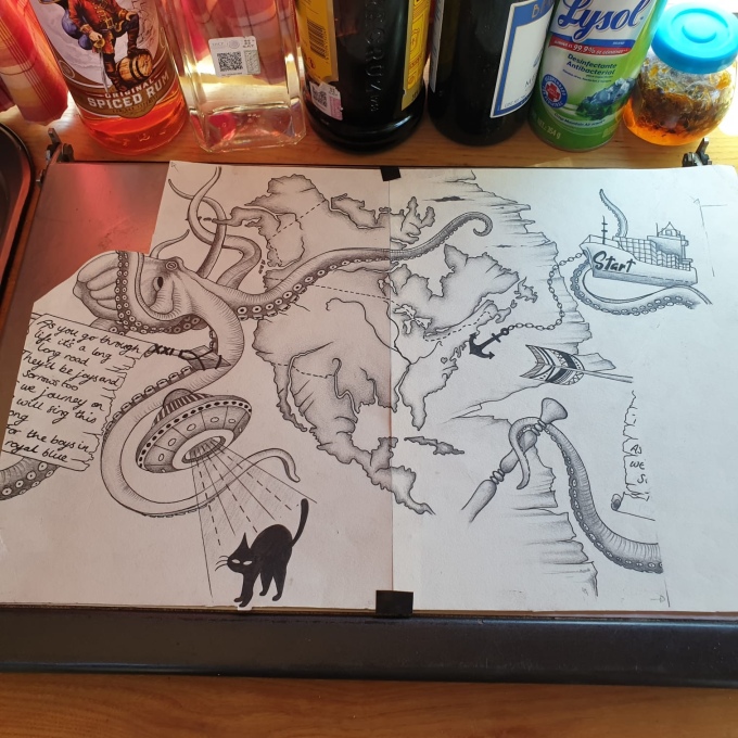 It was now the 9th of April. Lee’s birthday was imminent. I had decided what I wanted to get him, just not quite soon enough. Within the last few days amazon had extended there shipping times from 2 days to 2 weeks. This, coupled with the fact that it either had to be delivered or imported from the US and brought down the peninsula, meant that it probably wouldn’t realistically be here for another 4-5 weeks. Not wanting to tie or selves down again, as we were still waiting on an amazon package I’d ordered several weeks ago, I was out of options. The least I could do was finish the tattoo I had designed for him, he’s got the bottom half of his arm covered in South America, as this is where we initially planned to travel. I set about doing the second instalment, it's harder than just a regular drawing as you have to imagine how it will be when it's wrapped around an arm.