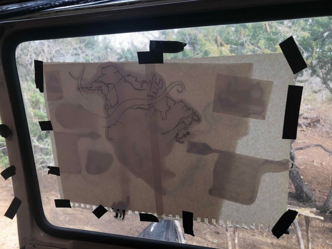 Speaking of catching up, Lee was about 5 weeks behind at this point so he had a lot to do. While I wasn’t so far behind, it was still good to pick a spot in the sun and crack on with a few bits and bobs for the day. Our batteries were also looking pretty sad again so we came up with an interesting solar panel arrangement to get the most out of the sun. Note the carefully balanced sticks to hold up the back door.