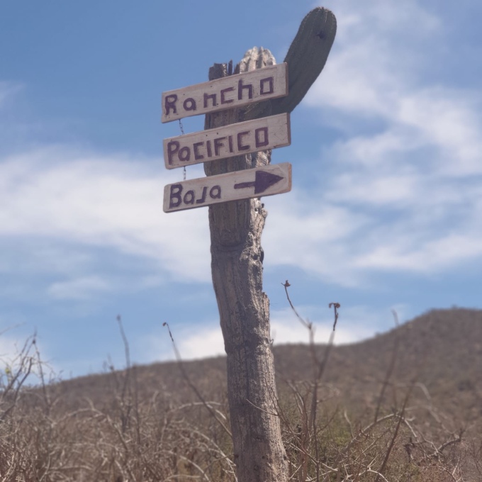 We drove down the main road and into the town of Pescadero, following the two German campers. At the town, we turned off left and headed out on a dirt track into the mountains. The two big rigs rolled easily along in front of us while we vibrated our way across the washboard road on tyres we hadn’t aired down. Fortunately it was only a couple of miles until we reach a sign that announced we had arrived at Rancho Pacifico Baja.