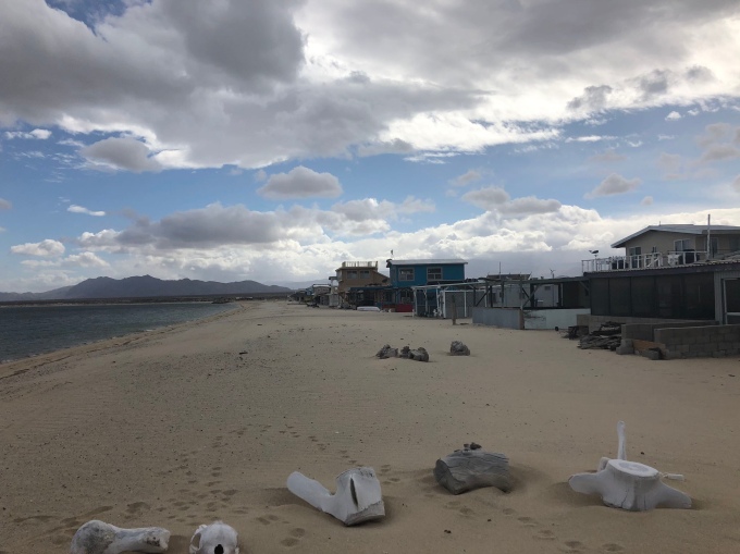 We had been in Mexico for nearly a week now and had still not had a proper taco, despite seeing them advertised everywhere for around 80p each. We were going to have them in El Rosario, but the broken sump took priority. Therefore, we decided to walk down to the restaurant at the end of the beach and see if they had some. It was a longer walk than I had realised, but it was nice to stroll along the beach and as always, pick up a few shells for my expanding collection. it seems to be a requirement of living here that you must have at least some whales bones outside of your house. As we walked down we saw bits of spines, ribs and jaws being using for a variety of decorations.