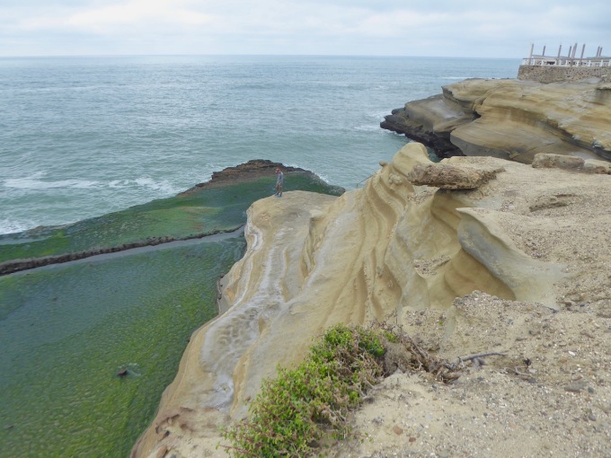 We walked down to the sea, via a dodgy staircase, where you could see some pretty colours running through the rocks and the clear signs of a cliff worn over hundreds of thousands of years by the waves.