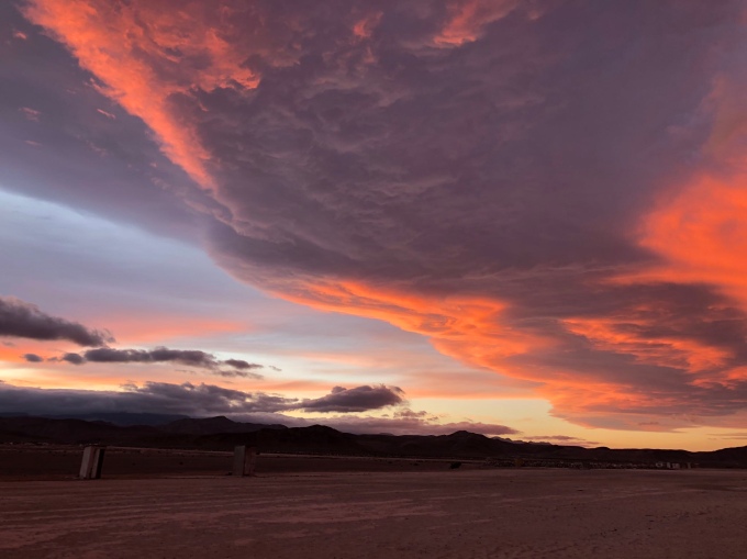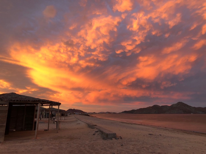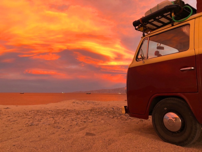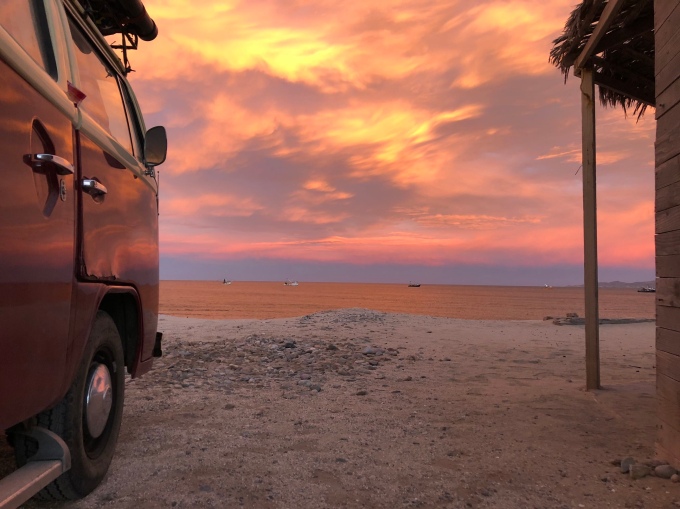The wind was quite fierce when we got there, and we hoped it would die down before nightfall otherwise we would be sleeping downstairs again. We spoke to a few people along the beach including an English bloke called Chris, who had just pulled up in his converted fire truck, and an American guy called Dean. Planning to speak to them more later, we watched what I think has been the best sunset I’ve ever seen. It started off looking like nothing much.