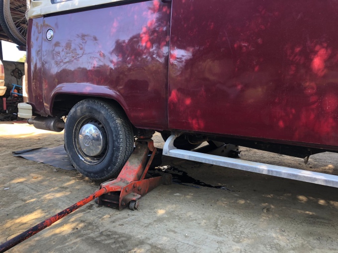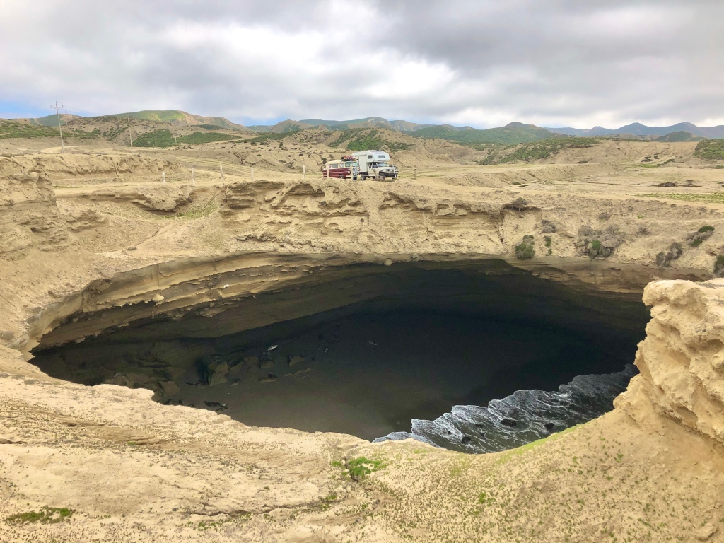 It was a fairly short drive from here to El Rosario, where we needed to get some fuel and groceries. We were parked up in the petrol station, when David came to tell us there was a problem. With the engine off, oil was pouring out of the sump and onto the floor. We had clearly hit it on a rock somewhere and without the suction of the oil pump we were making a big mess.