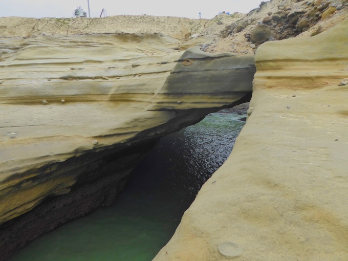 The pathway that the waves have cut into the rock to make this little place.