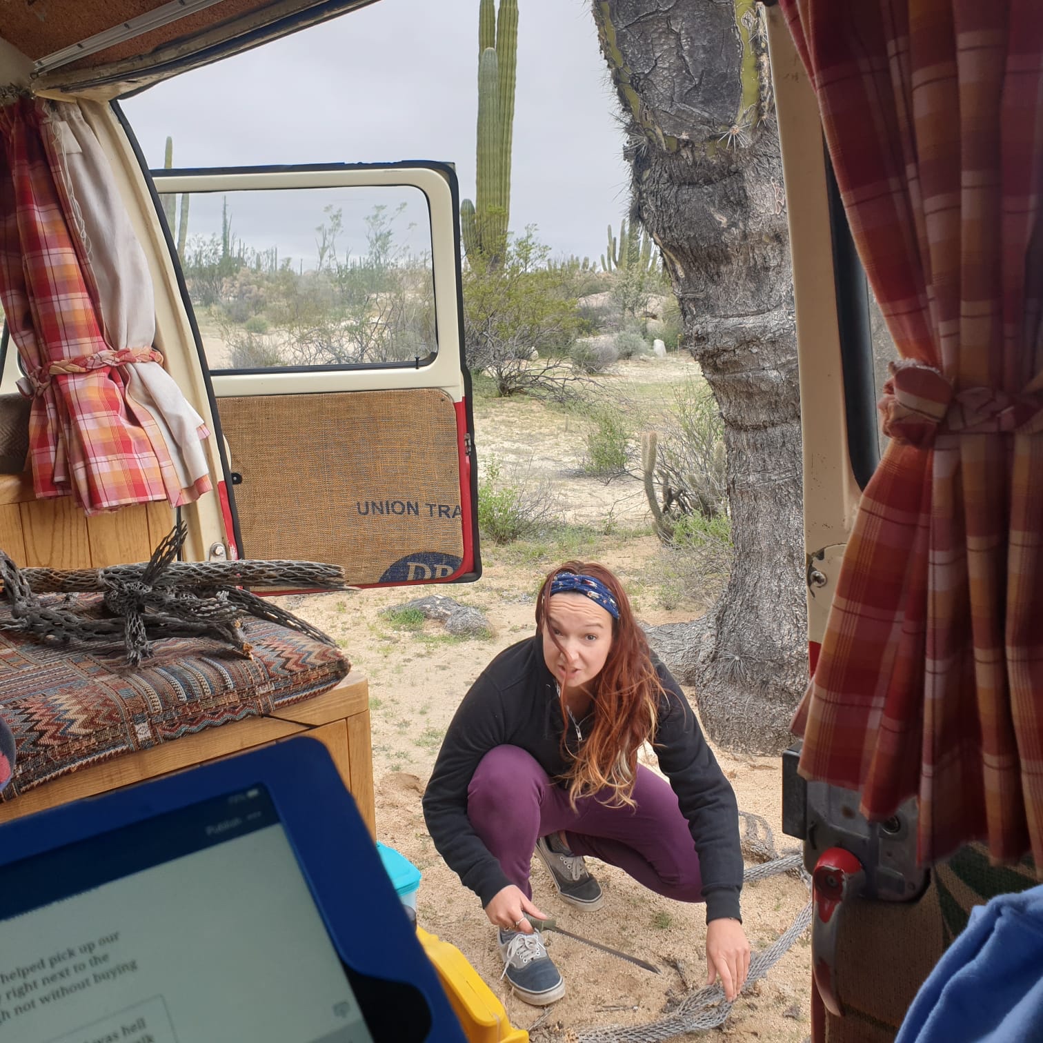 Having seen Lesley make a pretty awesome succulent holder out of a skeletal piece of cactus in San Diego, I wanted my own. Lee left me to my own devices while I spent a while picking through spiky rotting plants. In the end though, I had my trophies. Lee looked on a little doubtfully while I set about cutting them down to camper size...