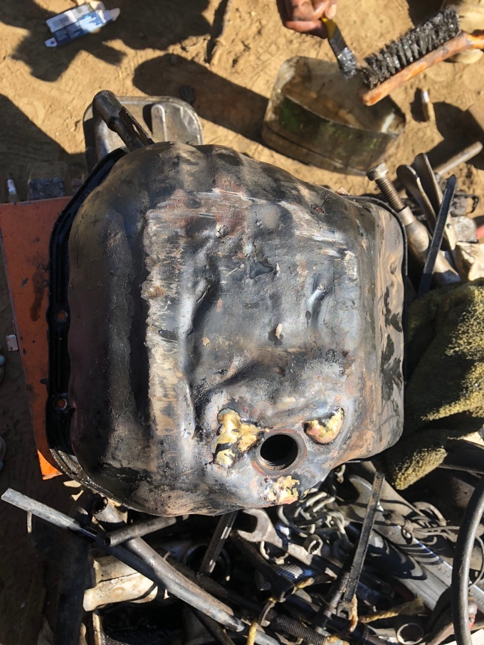 The drain plug, which is the lowest part, had hit and been squashed back up, creasing all the metal. This in turn had caused a small hole. Luckily it was small enough that we hadn’t lost much oil while driving and wouldn’t have damaged the engine. The mechanics bashed it out as best they could, and the brazed over the worst bits.