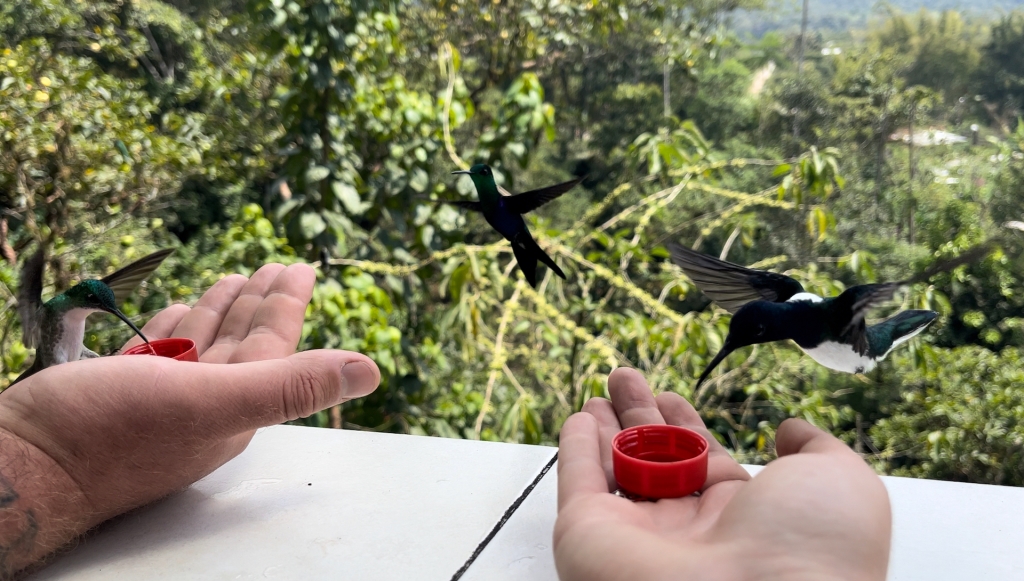 For $5 per person, you get entry to the garden and then we were told we could also feed the hummingbirds. That was an unexpected bonus and so we sat down next to the feeders on a wooden balcony overlooking the rest of the garden. The lady brought us over a bottle cap and filled it with a liquid, I’m not sure exactly what, for them to drink. We sat patiently with our hands out, bottle cap in the center and within a few seconds the air was filled with hummingbirds. They hovered in front of us, bickering over who got to drink first. They were all different shapes and sizes and were more than happy to sit on our hands while they had a drink.