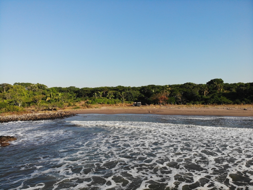 With that box checked, we drove another ten minutes onto Las Islitas, a good surf beach. Driving along by the sea, the beach is lined with restaurant after restaurant. It is clearly a touristy area, although now for the most part they are deserted. We drove on a little further to a spot marked as Stoner’s Point. Here there was a restaurant on the beach, and some kind of big industrial operation going on the other side of the road. The machinery emitting a constant high pitched whine. We wondered if that stopped at night or not. This was also not quite where the surf was, so Hanno and Kikki took Bruno as the more capable vehicle to see what happened to the dirt road. Not long later they reported back, it wasn’t possible to drive all the way to the surf beach, although we could camp down there. We decided to opt for Las Islitas, hoping to surf in the morning. Our surf app promising big waves.