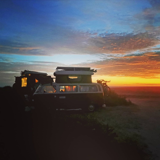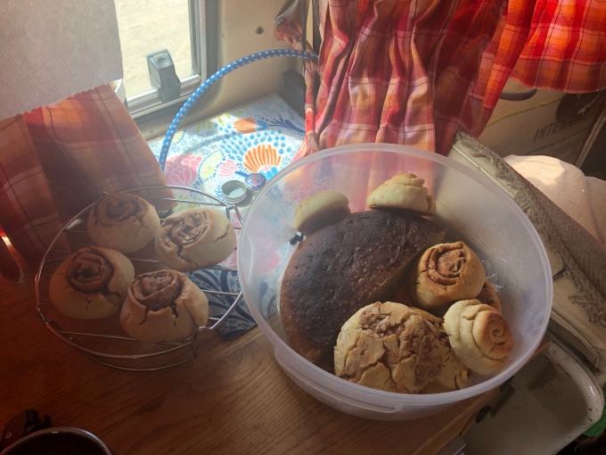 Dropping off the laundry en-route, we picked a spot on the map, and drove out there. It turned out to be next to some kind of sewage treatment plant with the beach still a walk away. It didn’t matter though, the cats could be let out safely and I spent some time making cinnamon rolls and kombucha. We also found a free water tap nearby and filled up our tanks.