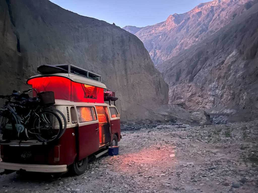 On the whole, the road was fine so far, but the final section before the spot we had decided to camp at had been subjected to a huge landslide and was narrow and rough. We waited for a lorry to pass before bumping Ruby along in the now dark. It was definitely not something I would choose to drive in the dark and it was lucky that it was only a few minutes before we reached a smaller road down to a huge level gravel area right by the river. In the darkness, we stopped on a fairly level patch, the river roaring below us and the road of the canon just above. I didn’t imagine there would be much traffic down here at night and even if there was the noise of the water would drown it out.