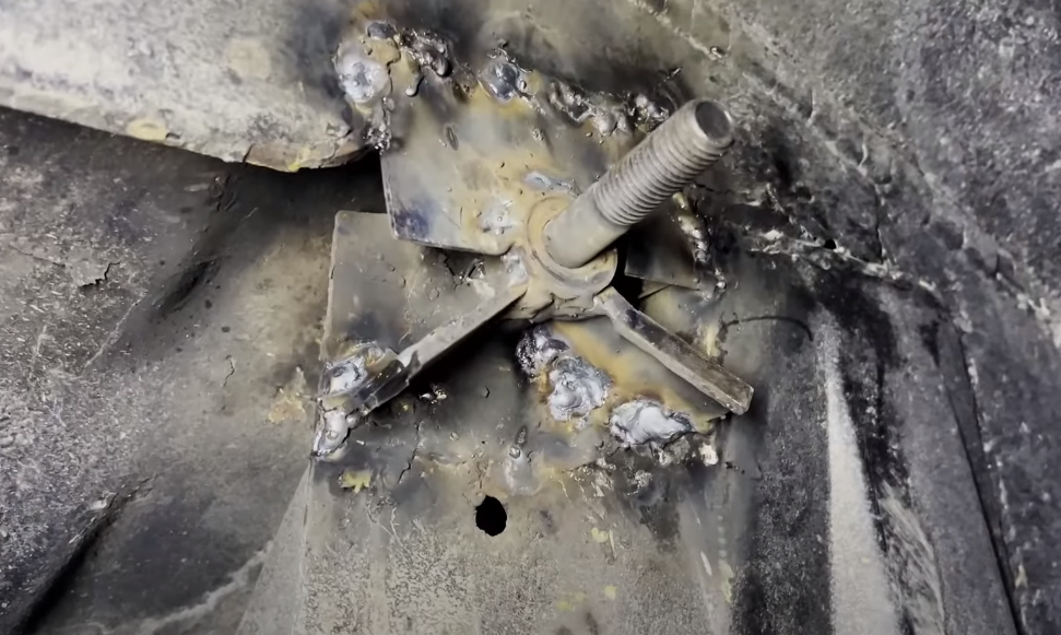 The other side required cutting the chassis apart to remove the old bolt as this side had not snapped. I did this and then moved onto the removing the bonded metal tubes out of the bushes on the old shock as our new shocks only had one set and we needed to re-use our old ones to fit them. Another fun job for a hot day. Lee was greeted on his successful return with the job of hacksawing through the remains of the bolt inside the square section where the grinder couldn’t reach. In the meantime, I set about making a patch for the bump stop. We had tried to fit them the day before only to find that the central metal piece that goes inside the rubber stop had rusted off. I made a new piece for this and then moved onto adding reinforcing plates to the spacer. It was getting late in the afternoon, but we powered on and as darkness fell I finished all the welding. The shocks were installed and the bump stops on. All we needed to do was put air in them and we would have proper suspension again. It was awesome to have this job finished and as Gonzalo came over we were happy to tell him we were done. We said we’d come back in the daylight to clean up the garage properly and before too long, we’d be able to leave.