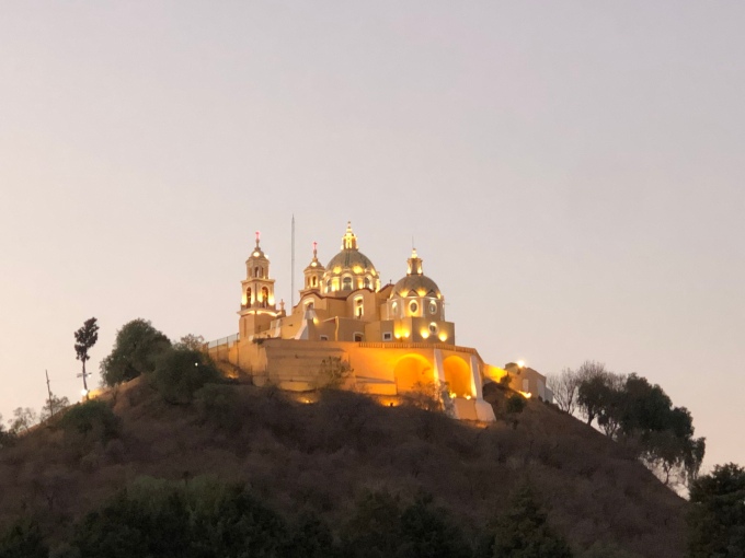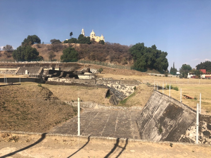 We wandered through the locked town before giving up and heading back to the camper. In between us and the van was the pyramid which we walked around the base of. The one side gave little away, it was just a big hill with a church on the top. From the other side you could see a little more through the gated fences, it wasn’t exactly impressive.