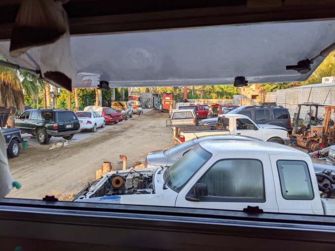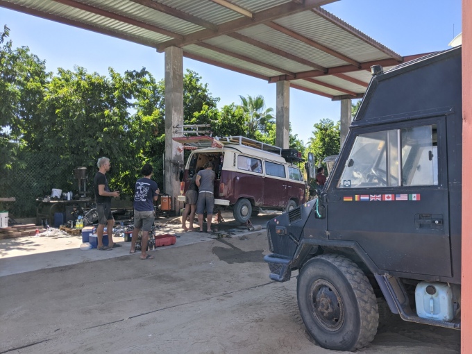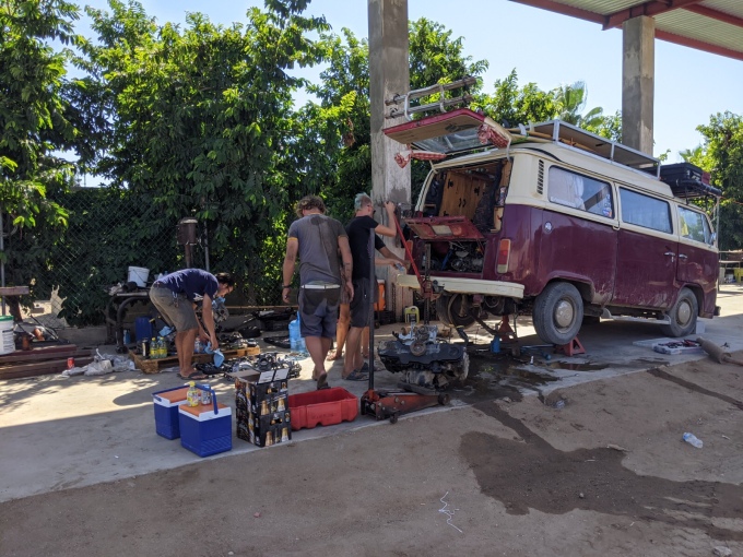 As we headed down the dirt road again this time on a tow rope, I felt like I had almost forgotten what it was like to drive. I had got rather accustomed to being pulled along silently. We made it to the garage with no drama, and no sight of Lee. He was still in the coffee shop having not seen us go past. We did have an engine update though, the delivery driver had decided to go early and instead of phoning us to meet him at an earlier time, had driven straight past us and on to Cabo much to the annoyance of not only ourselves but also his company. This meant that the engine now had to be reloaded onto another truck and brought back up. By the time I knew this, the truck was en route, meaning that we wouldn’t long to wait. In a way it worked out well as the small delivery truck was able to deliver the engine not only to the garage but directly to our working space, making things much easier. As it was their mistake, we also were charged only the initial $40 drop off fee, as supposed to the $90 they quoted us for having a small truck delivery before.