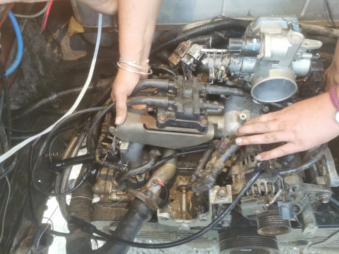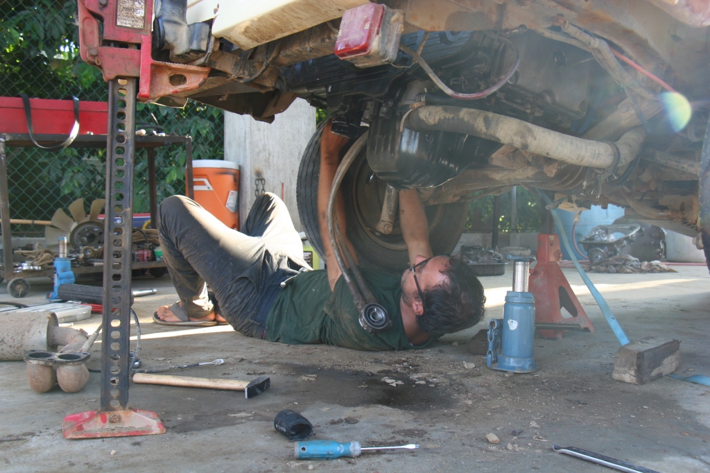 I set up Lee and Jaro with instructions of how to prepare the new engine. It needed a few parts removing, such as the alternator, air con and power steering pump. We needed to take the inlet manifold off too. While they set about this, I began to remove our current engine. We ended up working on the floor, as weren’t able to use the ramp, but actually it wasn’t too much of a problem. The garage has a nice concrete floor with a roof for shade, making it quite civilised.