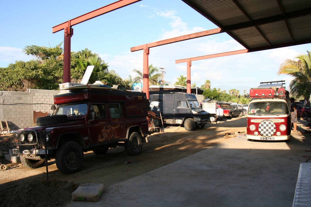 After everyone had eaten and had a few beers, we had a large tidy up. We were now ready to go. We decided to camp on San Pedrito, as it was quite close. I imagined we would have to stop and bleed the cooling system en route but we needed to test drive it. We went to pay Aaron, who told us to give what we wanted as we had done the work ourselves. We gave him 1000mxp which he seemed happy with as well as some decent spare engine parts from the new engine. No doubt the block is also worth a bit in scrap too. Our convoy then reversed out the garage and headed toward the beach. I sat in the back surrounded by toolkits listening to every little noise. The engine sounded very different, much quieter than our old one. I watched the temperature and was pleasantly surprised to see it rise and then fall. Perhaps dirt roads are a great way to bleed your cooling system as we arrived at the beach with no issues. Hanno and Kikki broke out a bottle of champagne and we celebrated two days of hard work with a successful ending. We were back on the road...