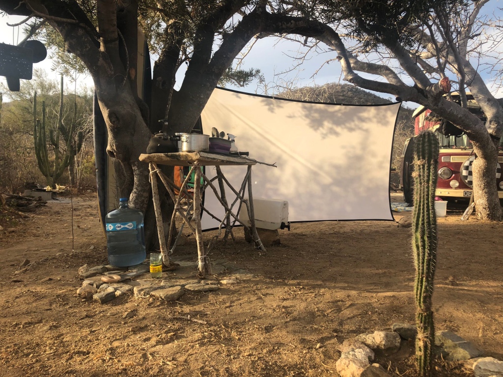 We had added a few rustic bits and bobs to our campsite, including a surfboard tale and setting up the projector screen.