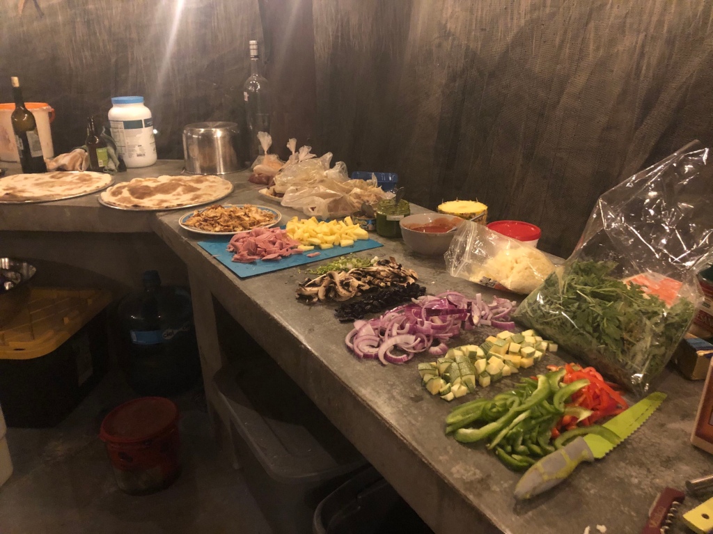 Shortly after, Hanno and Kerstin joined us at the top and the group was complete. Sabrina made an extensive amount of pizzas, and Hanno and I set about cutting up the toppings. With the bases pre-baked, we made a selection of different pizza ready to go back into the oven for a final cook.