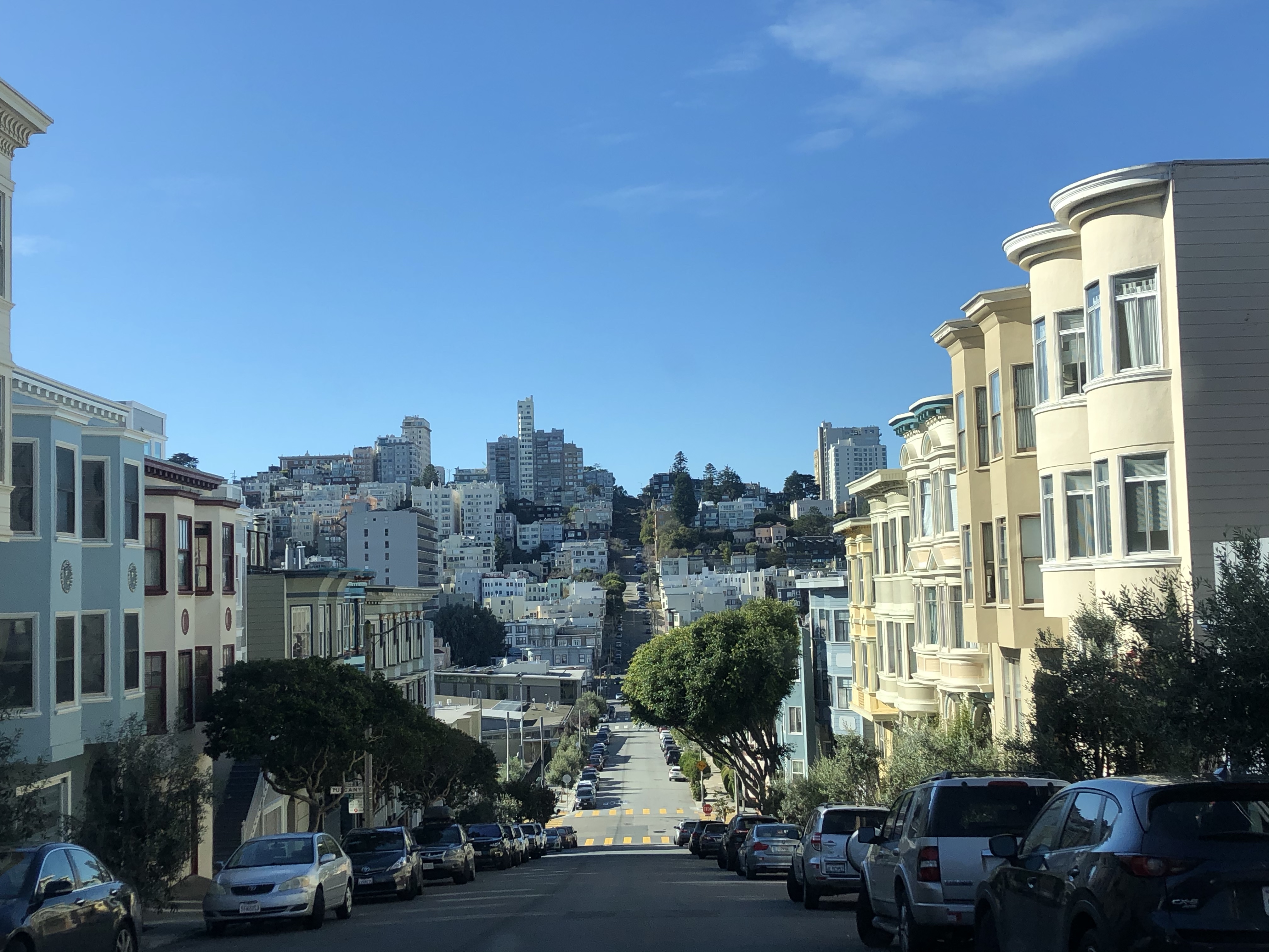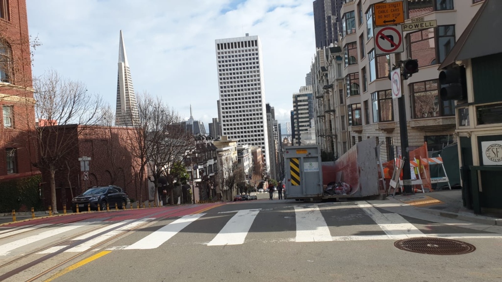 The final thing on our San Fran bucket list was to drive down Lombard Street. So back at the van we packed up, said our goodbyes to Pete and Carole, promising to visit them in Canada. Lombard Street is not far at all, in fact we had gone past the top of it on the tram earlier. This very famous street has little hairpin bends down it rather than a standard road. The section itself is just over 400ft long and has 8 hairpin bends that were designed to reduce the 27% gradient that would be too steep for most vehicles. It would definitely be hard to break the 5mph speed limit here. I got out to film it, while Lee drove down. While not particularly scary anymore, I imagine as a straight road it would have been terrifying!