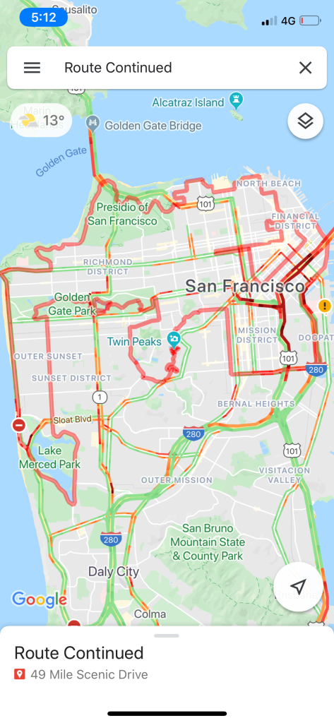 Our first morning in the city, we decided to drive San Fran’s 49 mile scenic drive route. My mum had found this in the guidebook and it was supposed to take you around a fairly comprehensive tour of the city, as you followed the signs. Sounds straightforward enough. My mum handed me the map and I became route navigator. Sounds straightforward enough, just follow the signs or map. The problem here was apparent immediately, when there was a distinct lack of signs. This left me trying to navigate with the map. Normally maps are fine, but this one was an artsy impression of a city. Only some roads had names and they also didn’t differentiate between major and minor roads which made it very hard to match the guide book map up to google maps. Getting pissed off with it already, I managed to find where someone had plotted the route on google, and we began to follow this. Occasionally our route was confirmed as correct by the odd ‘scenic drive’ sign here and there.