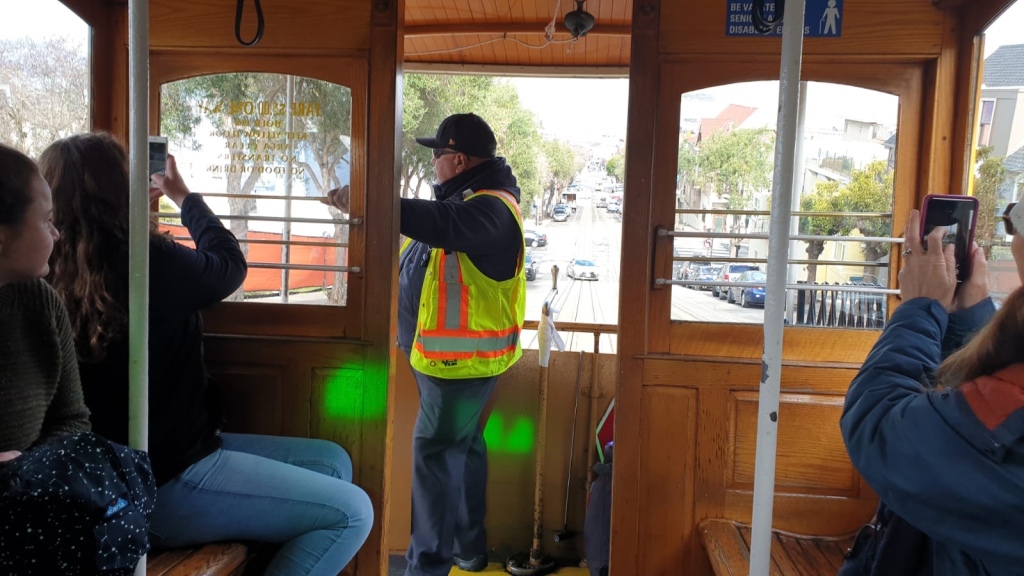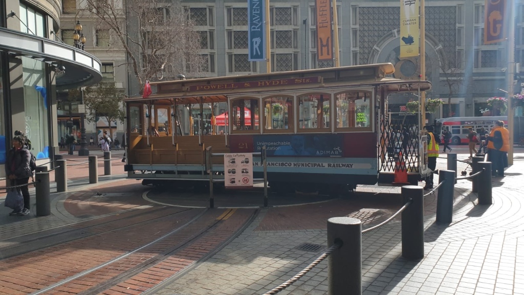 We stayed on the cable car right to the end, and it was pretty good fun. It was made even better by the very enthusiastic operator, who at one particularly steep hill took his hand off the controls, going, “Wheeeeeee!!!” before grabbing back on to slow us down. Once we had arrived at the end stop, Market Street, we watched as the turned the car around.