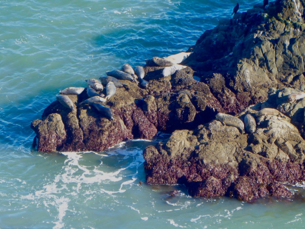 There were several sea lions on the rocks below and swimming in the sea.