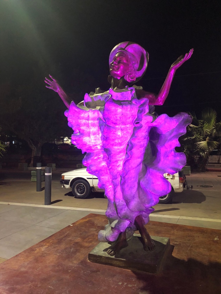 We wandered around in the easy indecision that comes from having a lot of people in one group. John and Danny wanted a steak, we wanted vegan tacos and Rachel and Ola had already eaten. We ended up sitting down at restaurant on the seafront, moving all the tables around and receiving menus, before deciding that we would actually walk back the way we had come. The place we had played pool the night before offered steaks and was only around the corner from the vegan tacos. It was therefore kind of disappointing, for John and Danny at least, when we got there to find it closed. We walked around to Mango Blues and that was closed too, so there we were, all disappointed together. We did at least see some cool sculptures on our wanderings.