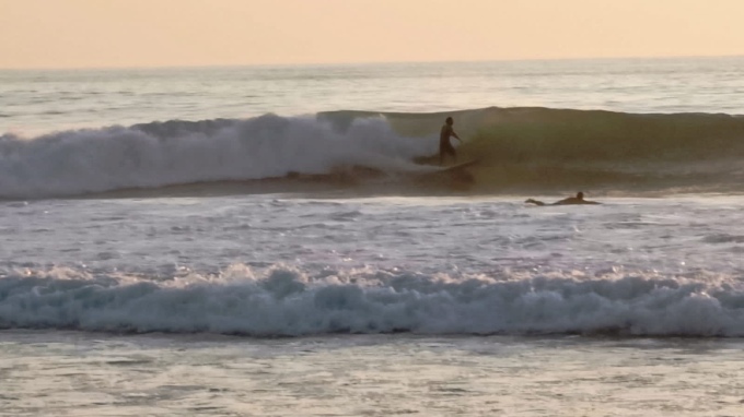 The next morning, was a lazy start. Due to a late night and a long day before. Normally the best surf is early morning or late evening. The sea is smoother and the waves cleaner. We were up a bit late, and observed the waves. They were still big. It was hard to tell how big until a surfer caught one, then you could see that the waves were bigger than the people. Still, we had come here to surf, so we got our boards and headed across the river and further down the beach towards the bay. Here the waves seemed a little smaller. Here's someones else, catching one of the small ones.