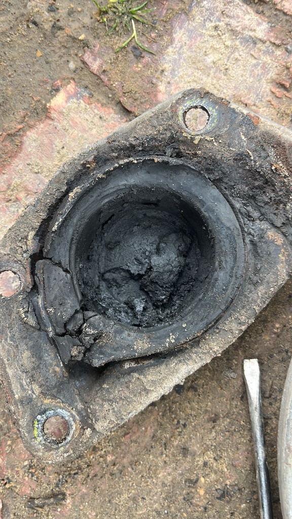 The first thing to do was to assess the extent of the problem. We jacked up the car on the driveway and began to take the rear suspension apart. To order a new bar we needed to check the size of what we had already. It was an easy enough job to take it all apart, a broken bar meant that there was no load at all on the suspension. I undid the bushing cover and the front piece of the bar fell out, a bit of a wiggle and we had the other part. At this point we also realised the brake line had been cut when the suspension had over compressed and the driveshaft had hit the chassis. The bushings, needless to say, were now mush.