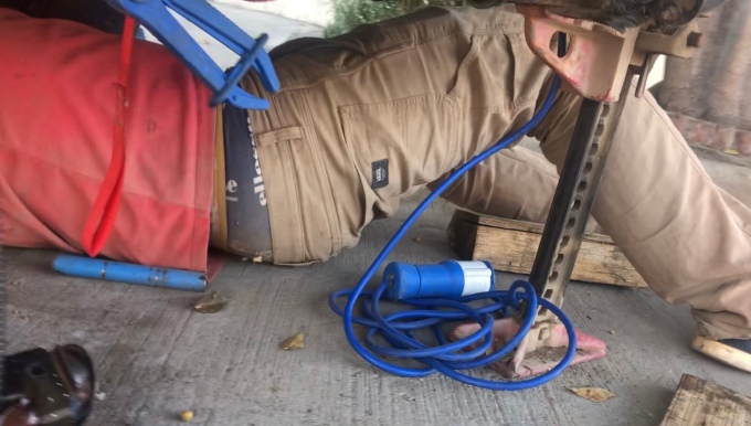 To summarise the next few hours, we spent an inordinate amount of time trying to get the engine and clutch together. The back of the van wobbled precariously in the air, while the trolley jack constantly sank, threatening to damage either the clutch or gearbox as we tried to line them up. We nearly dropped the engine several times it was a very difficult job. In the end we suspended it from ratchet straps and used these to help take the weight, we were both not happy about safety at this point. I’m not someone who is overly cautious about health and safety, happily chopping up sheet metal in my flip flops with the grinder, welding gloves definitely considered optional, but this wasn’t good. We were both incredibly relieved when with a big wiggle, the engine finally aligned with the clutch. We quickly got the bolts in and the engine mount in place. That was the difficult bit done and we could now do the rest without worrying that the camper or the engine was about to crush us.