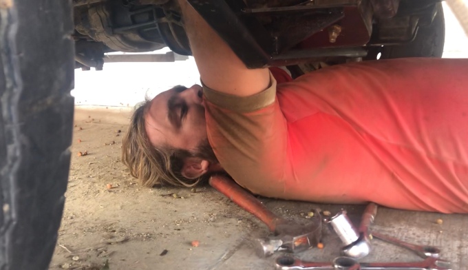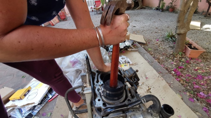 Lee returned from his mission with no luck, it looked like a lot of gasket seal would be happening instead. Still, at this point we had the heads on and the clutch. The block was back together and ready to go in. We asked Gerado for the axle stands but it turns out that he had returned them to his dad. This meant we had Jaro’s jack to hold up the back of the car, it’s not hydraulic so it can’t fail in that way, but it is not the most stable with it's tiny little base and we had no stands to make it properly safe. Ruby wobbled ominously, and we debated calling the whole thing off. Can't celebrate Christmas if you've been crushed by your camper.