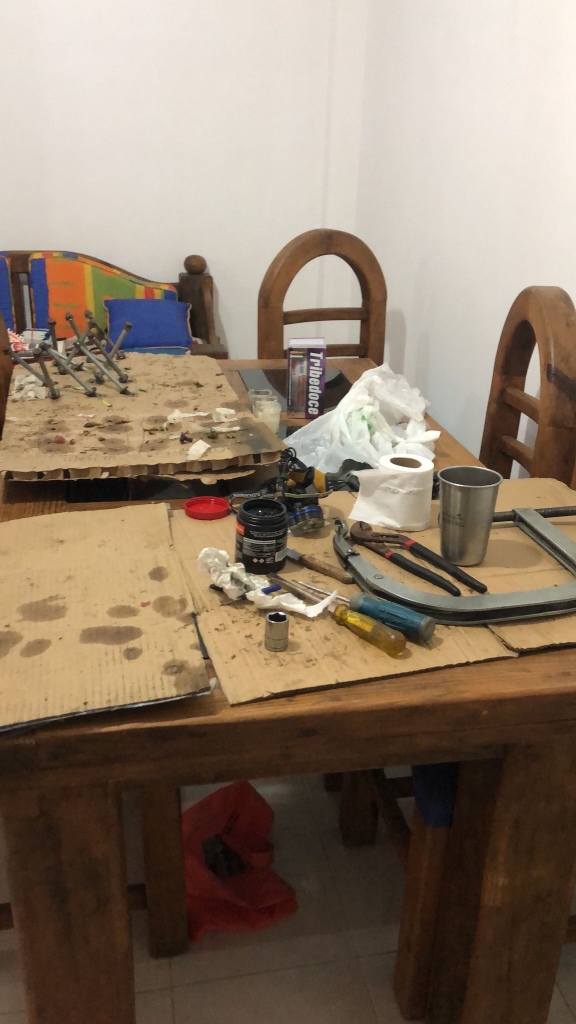 The light was now failing, and we decided to take the cylinder heads into the apartment and rebuild them there. Then in the morning, we could torque the heads fit the clutch and we were in business. I hoped to have the engine in the next day, test drive Wednesday and then leave Thursday, Christmas Eve.