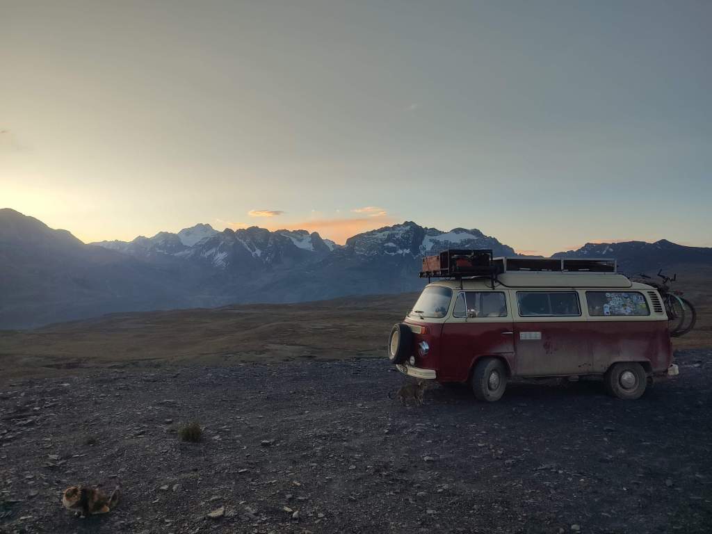 By the time we had got to the guys house, checked it worked, paid and driven off, there was only a few hours of daylight left. We started heading out of the capital, planning to wild camp near the start of the death road for the morning. Due to leaving the city at a different point, we took a different, higher road than we had previously driven. We bumped along a gravel road in the beautiful mountains at about 4700m. We hadn't planned to camp here but as we drove past the mountain ranges with the snow a pastel pink in the setting sun, we thought we just have to enjoy this view. There was a huge space by the side of the road and we pulled off and parked at the edge of a cliff, enjoying some breath taking views of the mountains in the last of the light.