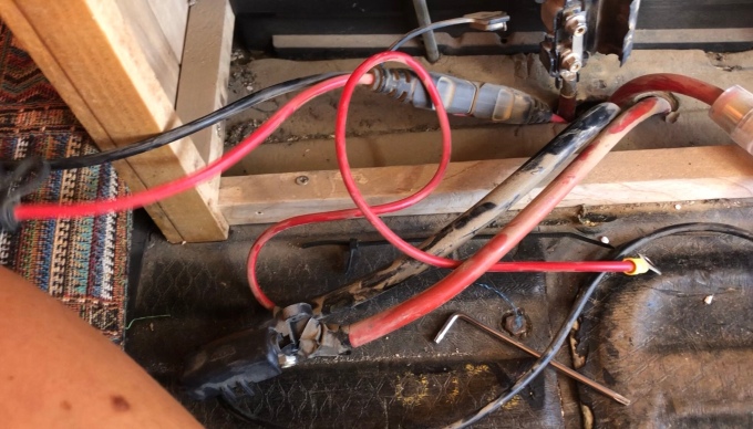 Here you can see the main power feed wires that run across the van, suppling the amp, inverter, fuse board and solar system.