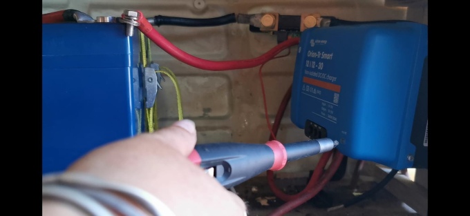 A simple enough thing to install, Lee was back from helping Dane out up at the top and so began removing the old split charge circuit. The one thing with working out here was the lack of supplies. You really don’t want to cut a wire wrong or run out of connectors, it’s a long drive to get another one. We reused the old wiring where possible and had just enough connectors to complete the heavy-duty wiring. The B2B charger was probably the most complicated thing to install as it had to be mounted vertically with good ventilation, this meant creating some custom brackets out of our old battery holders to keep it in place. Here you can see the mounted charger with the shunt for the battery monitor behind it on the wall.
