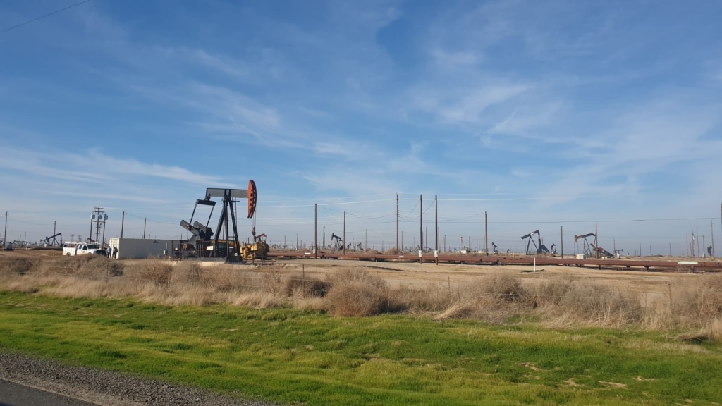 Mountains crossed, the landscape changed again and we drove past groves of orange trees and then on into large oil fields, everything now completely flat.